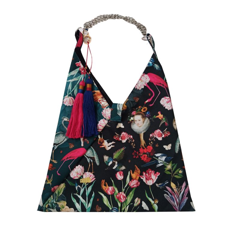 Inspirada en las bolsas Azuma Bukuro. Material de alta calidad: Loneta de uso a largo plazo. Gran capacidad: El tamaño de la bolsa es de 52 cms de base por 58 cms de altura. Cuenta con broche de imán, forro y bolso interior para guardar cartera, celular, etc. Asas de cadena metálica. Uso versátil: La bolsa origami tiene una forma de triángulo única, es ligera, espaciosa y se puede doblar y guardar en una bolsa mas grande o maleta para que la lleves siempre contigo. Incluye un hermoso bagcharm realizado 100% a mano y pieza para llavero. El color, diseño y tamaño del bagcharm puede variar a como se muestra en el foto – ya que cada pieza es hecha a mano y no son siempre iguales.